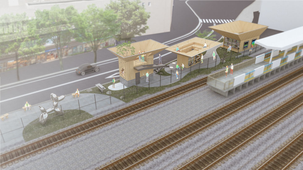 敷地内にはたくさんの座れる場所を用意しており、女性トイレ棟と男性用トイレ棟はあえて距離を離し、中心にBOOKカフェスタンド棟を配置した。男性と女性ではトイレの利用時間も異なるため、片方が待っている時間の過ごし方として中心に別機能があることが配棟のポイントとなっている。また、Book+CafeStand棟は上部2Fへ上がれるようになっており、地上と切り離すことでゆったりとした時間を過ごす場所を確保した。全ての棟について建物を敷地の端に寄せずに隙間を空けて回遊性を確保し、4面それぞれがファサードの機能を有することでJR京浜東北線のホームや電車内からも正面性のある佇まいとしている。